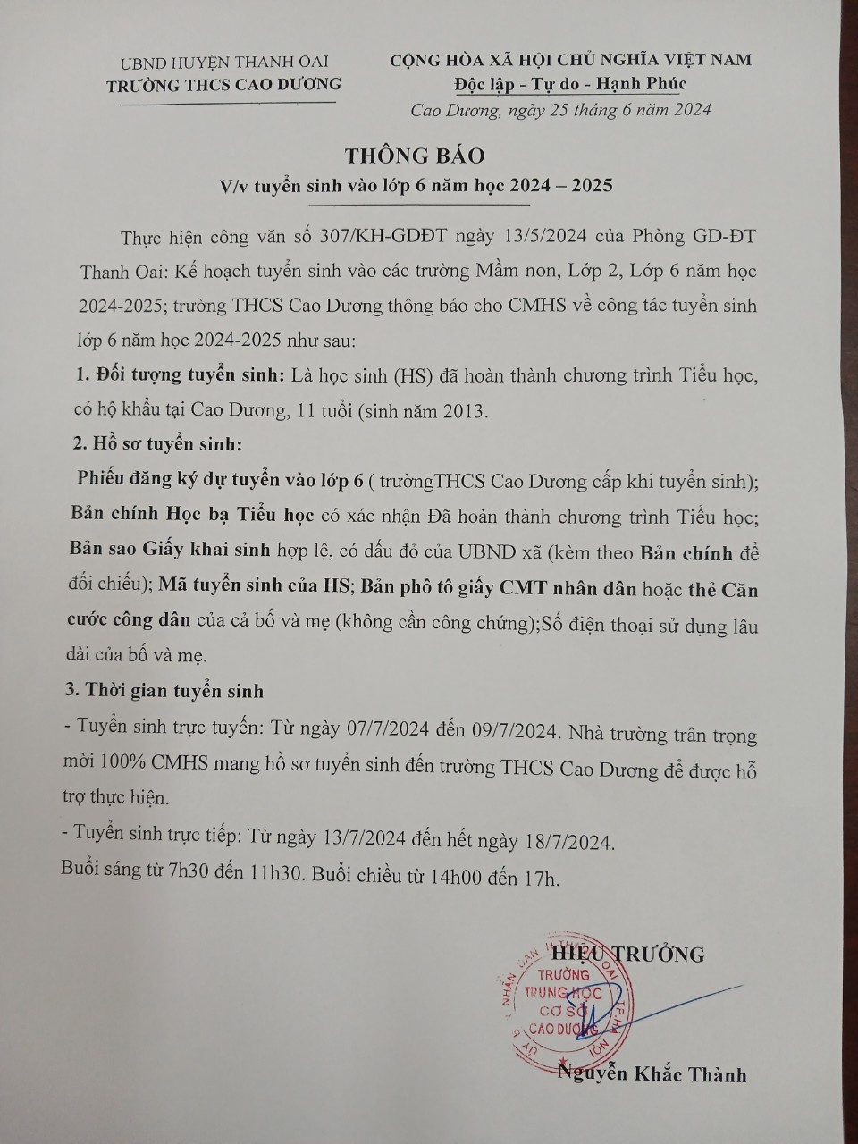 Thông báo tuyển sinh lớp 6 năm học 2024-2025